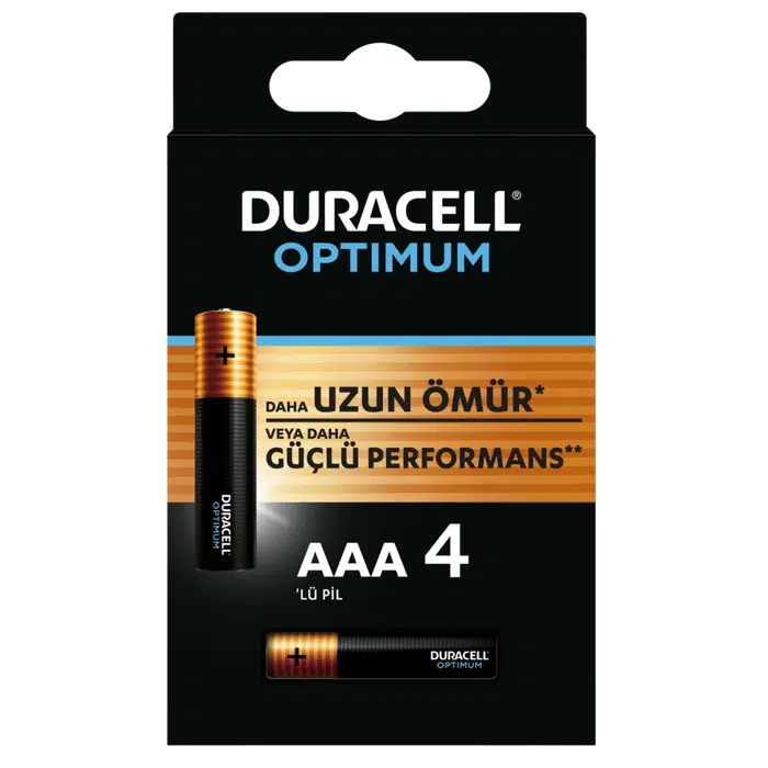 Yeni Duracell Optimum. En Yüksek Performanslı AAA Alkalin pilimiz Duracell'in bugüne kadarki en yenilikçi teknolojisi, yepyeni Duracell Optimum alkalin pil, bazı cihazlarda¹ %100'e kadar Daha Uzun Ömür, veya diğer cihazlarda² Daha Güçlü Performans sunan yeni bir katot sistemine sahiptir. Daha Uzun Ömür: Duracell Optimum AAA, oyuncaklar gibi bazı cihazlarda daha uzun süre dayanır³. Ve uzun ömürlü piller, tüm cihaz kullanıcıları için daha uzun süreli eğlence anlamına gelir. Daha Güçlü Performans: Duracell Optimum AAA pek çok cihazda diğer Duracell Alkalin pillerden daha güçlü performans sağlar² – örn. uzaktan kumandalı araba gibi cihazlarda motorlar daha hızlı çalışır (Spin Master Monster Jam official grave digger uzaktan kumandalı 1:24 ölçekli kamyon)?. Optimum Performans Optimum Ambalajla buluştu Duracell Optimum'un yeni ve yenilikçi "kitap" şeklindeki ambalajı açılıp kapanır bir kapıya ve iç kısımda düzenleyici bir tepsiye sahip. Bu da pillerin artık mutfak çekmecesi içinde yuvarlanmayacağı anlamına geliyor! Bunun yerine pilleriniz, siz onları kullanmaya hazır olana kadar rahat ve güvenli bir şekilde saklanıyor. Ve piller bittiğinde, onları geri dönüştürülmeye hazır olarak saklayabiliyorsunuz. Ambalaj %100 geri dönüştürülebilir ve %0 plastik içerir. Duracell Optimum. Daha Uzun Ömür¹ veya Daha Güçlü Performans² Duracell Optimum piller AA ve AAA formatlarında üretilir. Cihazınıza Duracell'in bugüne kadarki en yenilikçi teknolojisiyle sınıf atlatın ; Duracell Optimum AAA piller, cihazlarınızdan en yüksek verimi almanız için DAHA UZUN ÖMÜR* veya DAHA GÜÇLÜ PERFORMANS** sağlar. ; DAHA UZUN ÖMÜR = Duracell Optimum, oyuncaklar gibi bazı cihazlarda daha uzun süre dayanır*** ; DAHA GÜÇLÜ PERFORMANS = Duracell Optimum, diğer cihazlarda daha yüksek verim elde etmek için önceki Duracell Alkalin pillerden daha güçlü performans** sağlar (örn. Spin Master Monster Jam 1:24 kamyon****). ; OPTİMUM SAKLAMA: Duracell Optimum'un ambalajı yeni pilleri yerinde tutar ve kullanılmış pillerin geri dönüşüm için güvenli bir şekilde saklanmasını sağlar ; %100 GERİ DÖNÜŞÜMLÜ AMBALAJ: Duracell Optimum'un ambalajı %100 geri dönüştürülebilir ve %0 plastik içerir ; *2015 IEC oyuncak testindeki ( ) Minimum Ortalama Süresine kıyasla AAA boyutlu pillerde daha uzun ömür **VEYA belirli cihazlarda diğer Duracell alkalin AAA pillere kıyasla daha güçlü performans sağlar. Sonuçlar cihaza veya kullanım şekline göre değişebilir. Daha fazla bilgi için: ; ****Spin Master Monster Jam Official Grave Digger uzaktan kumandalı 1:24 ölçekli kamyon 2.4 GHz, Ürün No. 6047111/604495 için diğer Duracell alkalin AA pillerden daha güçlü performans sağlar. Sonuçlar cihaza veya kullanım şekline göre değişebilir. Daha fazla bilgi için: ;