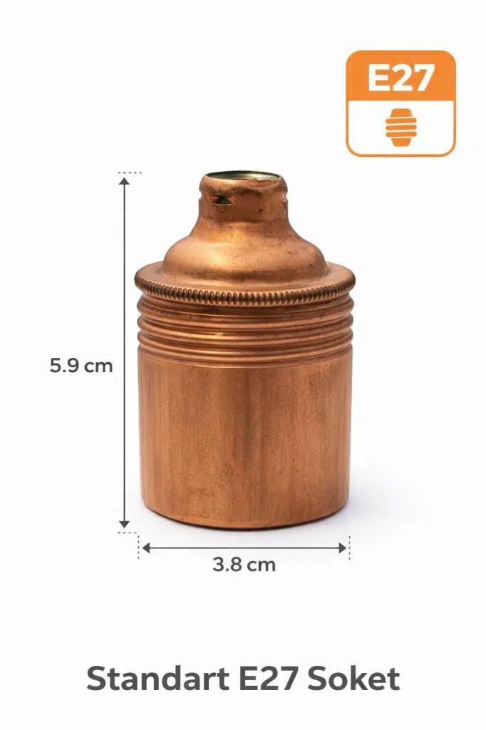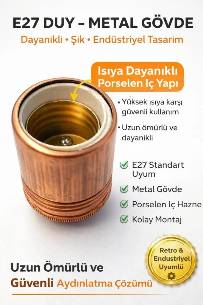 Estetik ve dayanıklılığı bir arada sunan E27 bakır duy, dış yüzeyde şık bakır metal gövde ve iç kısımda ısıya dayanıklı porselen yapı ile hem güvenli hem de dekoratif bir aydınlatma çözümüdür.