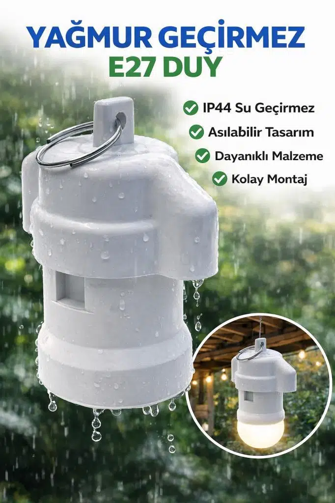 Dış mekan kullanımına uygun, E27 uyumlu yağmur duy, dayanıklı yapısı ve yanmaz plastik gövdesi ile güvenli aydınlatma sağlar. Balkon, bahçe, şantiye ve endüstriyel alanlar için ideal çözümdür.