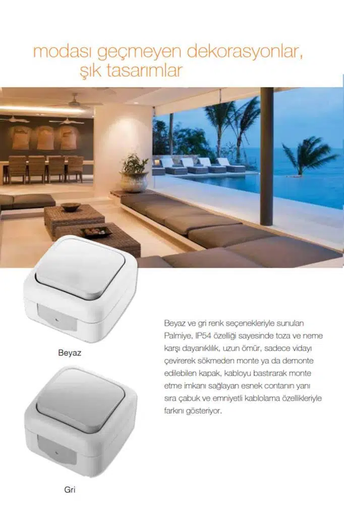 * Palmiye anahtar ve priz serisi balkon, teras, garaj gibi nemli ve tozlu ortamlar için geliştirilmiştir.